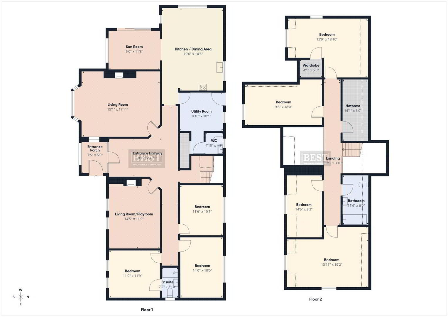 • Ground Floor Accommodation: Entrance Porch, Entrance Hall, Lounge, Living Room/Playroom, Kitchen/Dining Area, Sunroom, Utility Room, Pantry, Separate W.C., Three Bedrooms (one with Ensuite Shower Room).