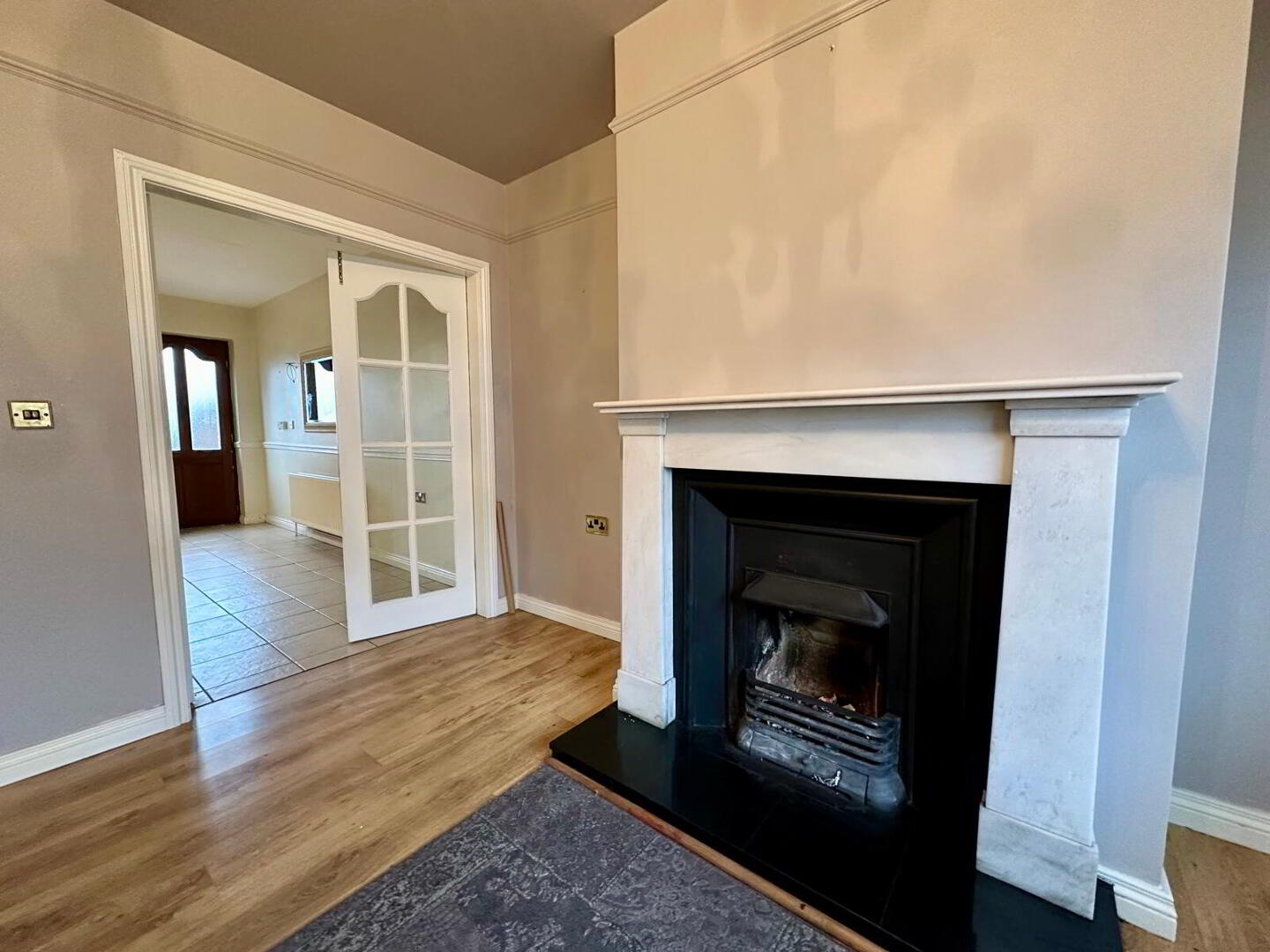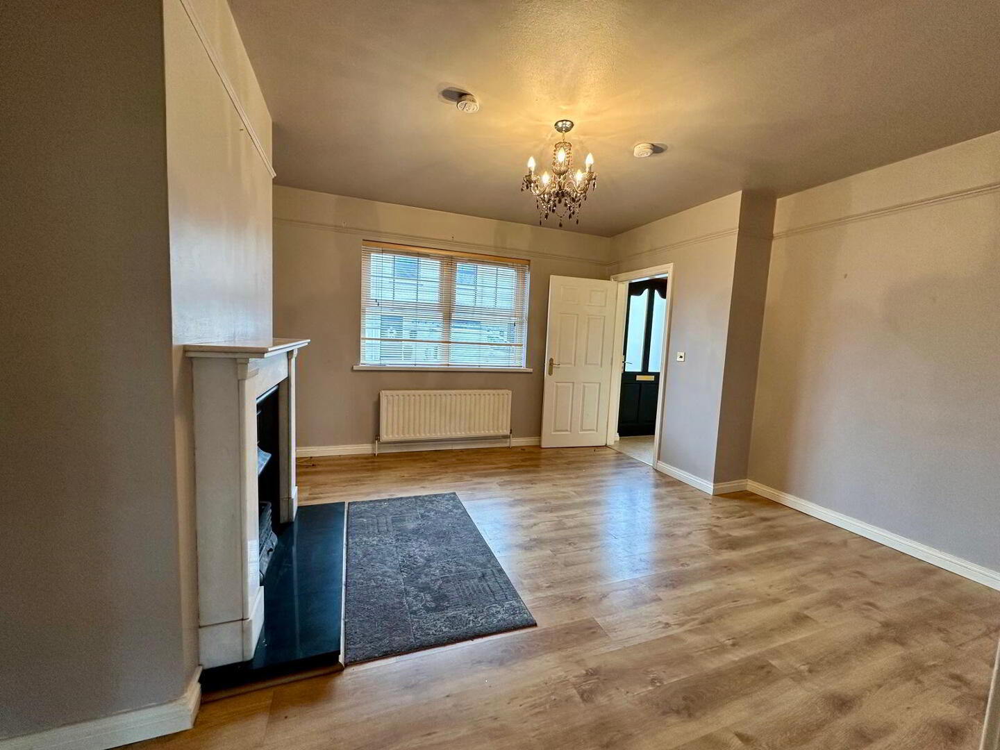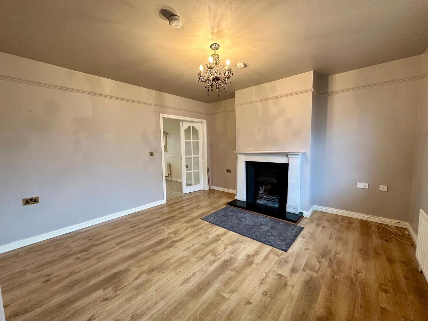 Laminate flooring, fire place with granite hearth and surround, double panel radiator, double French doors leading to kitchen/dining room.