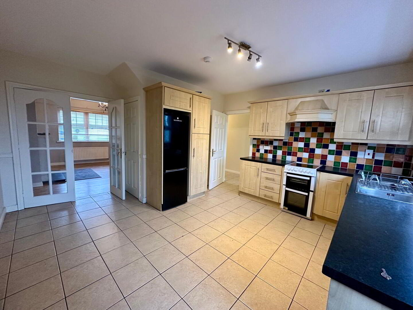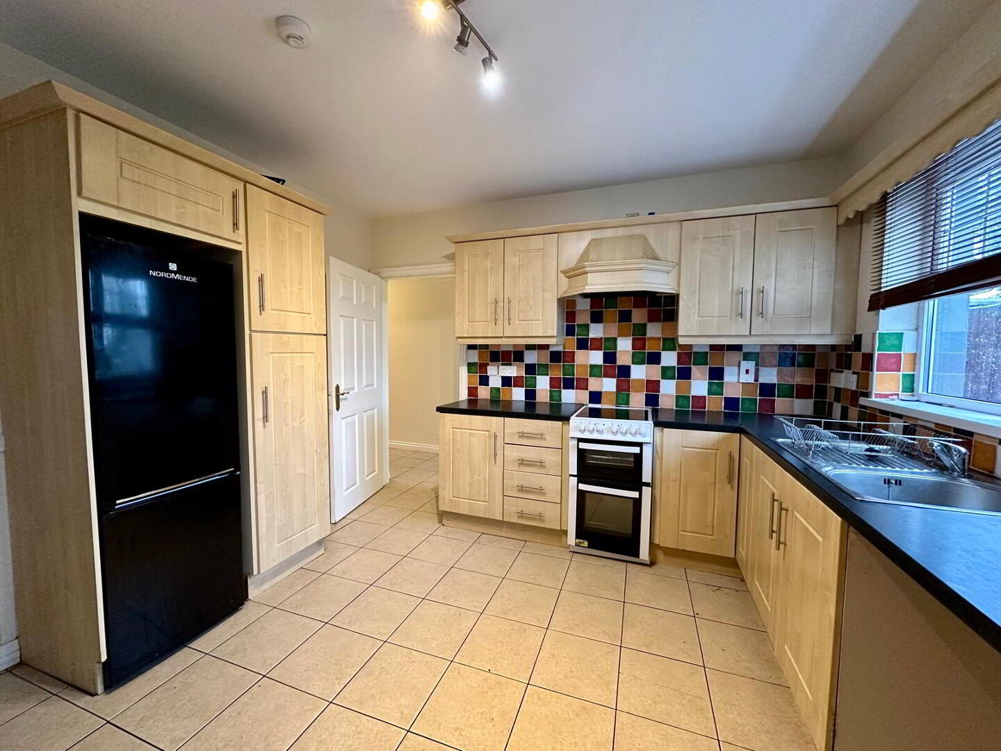 Tile flooring, tile splashback, double panel radiator, NordMende fridge/freezer, extractor fan, New World cooker.