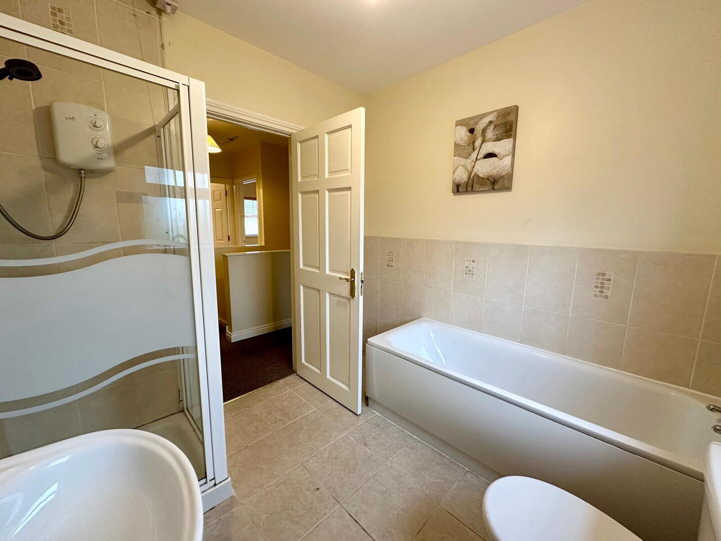 Upstairs, there are three bedrooms along with a main bathroom that includes both a bath and a separate shower. The interior is mostly neutral, giving a blank canvas for updating or personalising.