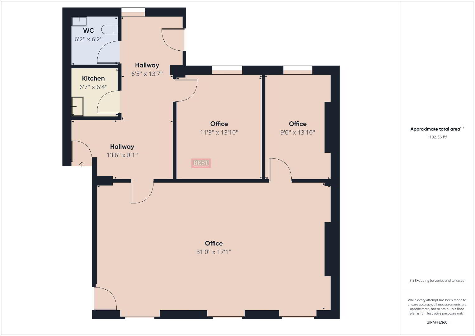 2 private offices, 1 large meeting room, W/C facilities, kitchen facilities and a rooftop smoking area.
