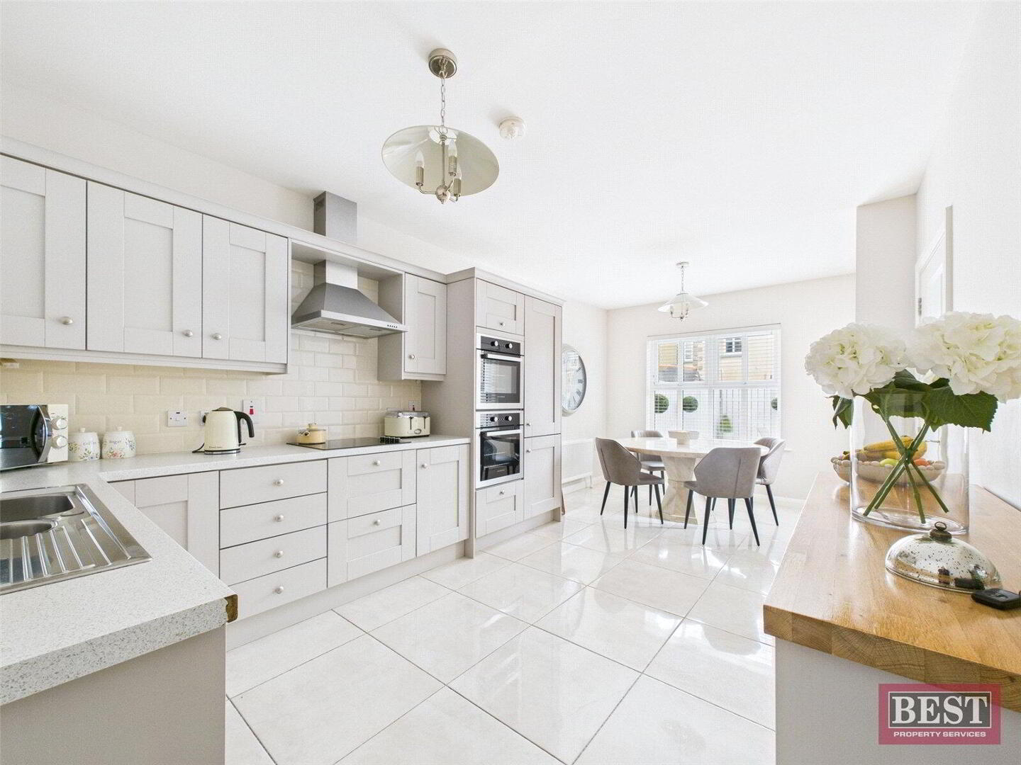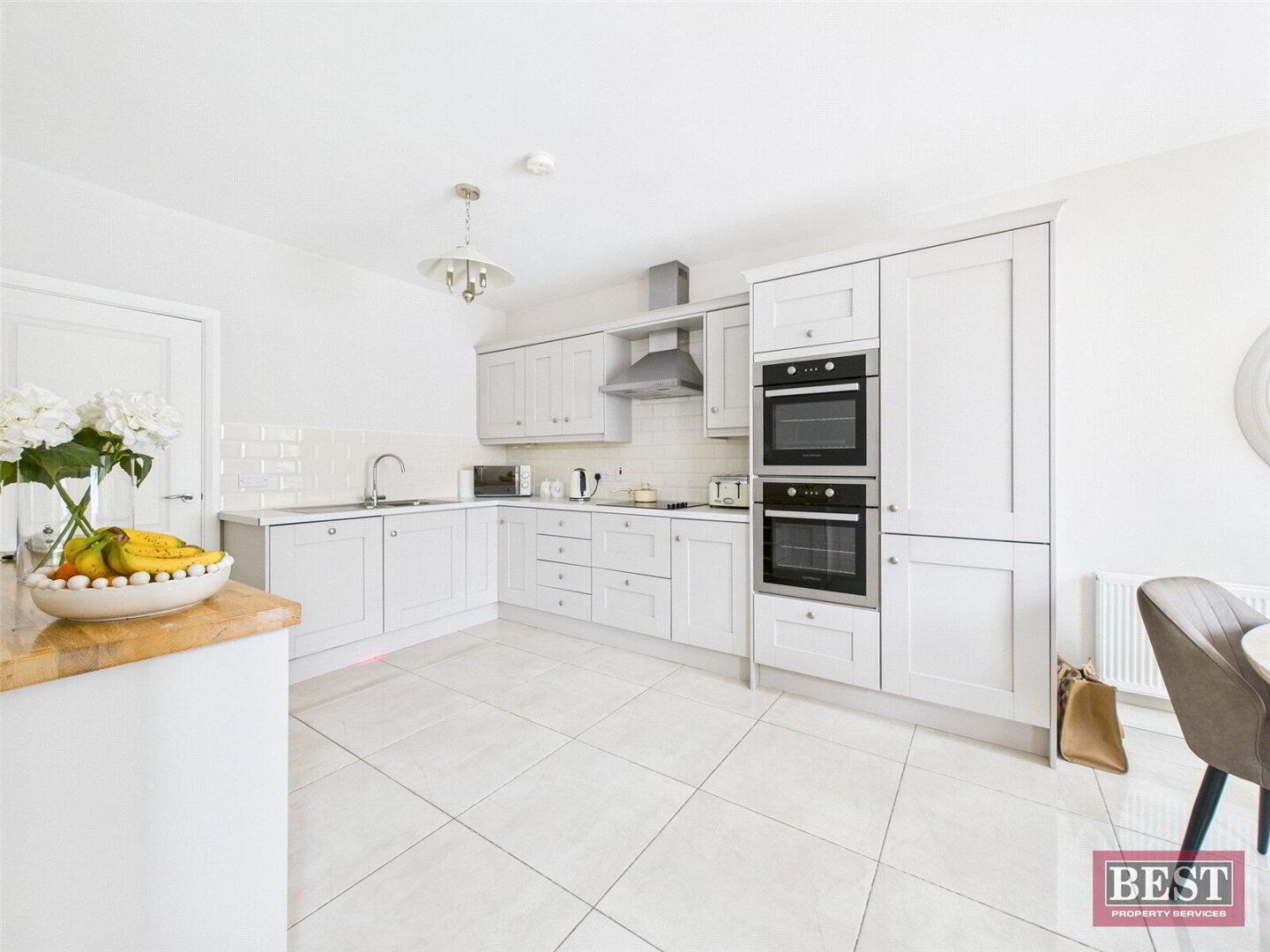 To the rear of the property is a generous kitchen/dining area, fitted with a range of modern upper and lower level units and benefiting from integrated hob, double oven and dishwasher. The space is finished with tiled flooring and partial wall tiling, making it both stylish and practical.