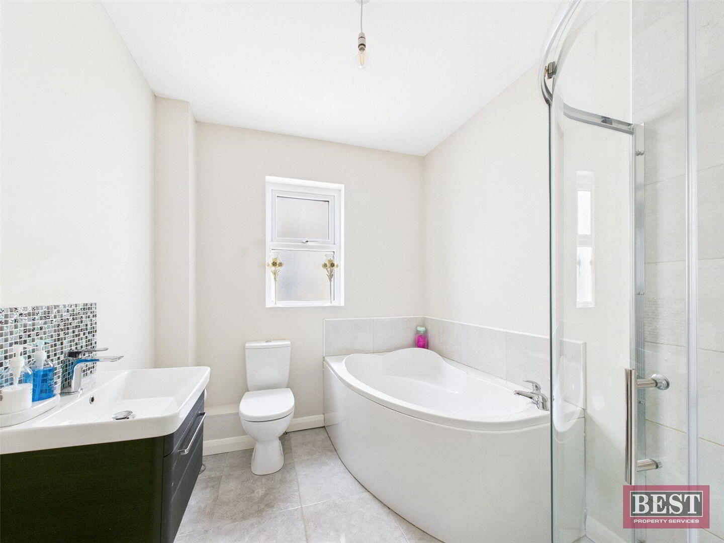 Bedroom one, rear facing, features carpet flooring and a bank of built-in wardrobes. Bedroom two, also rear facing, is carpeted and well proportioned. The family bathroom is located on the middle elevation and comprises a white suite including corner bath, WC and wash hand basin with vanity unit, along with a separate fully tiled shower cubicle and tiled flooring.