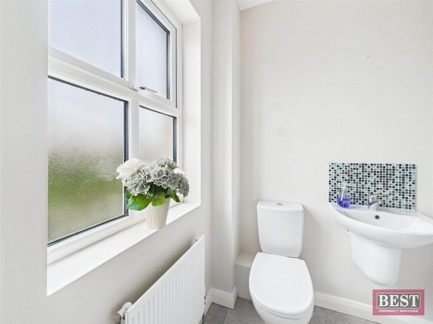 A separate utility room, also rear facing, provides additional storage with upper and lower units, a single drainer sink, and plumbing for a washing machine and dryer. This area is finished with tiled flooring and partial wall tiling and offers direct access to the rear patio area. A separate WC with a two-piece suite completes the ground floor accommodation.