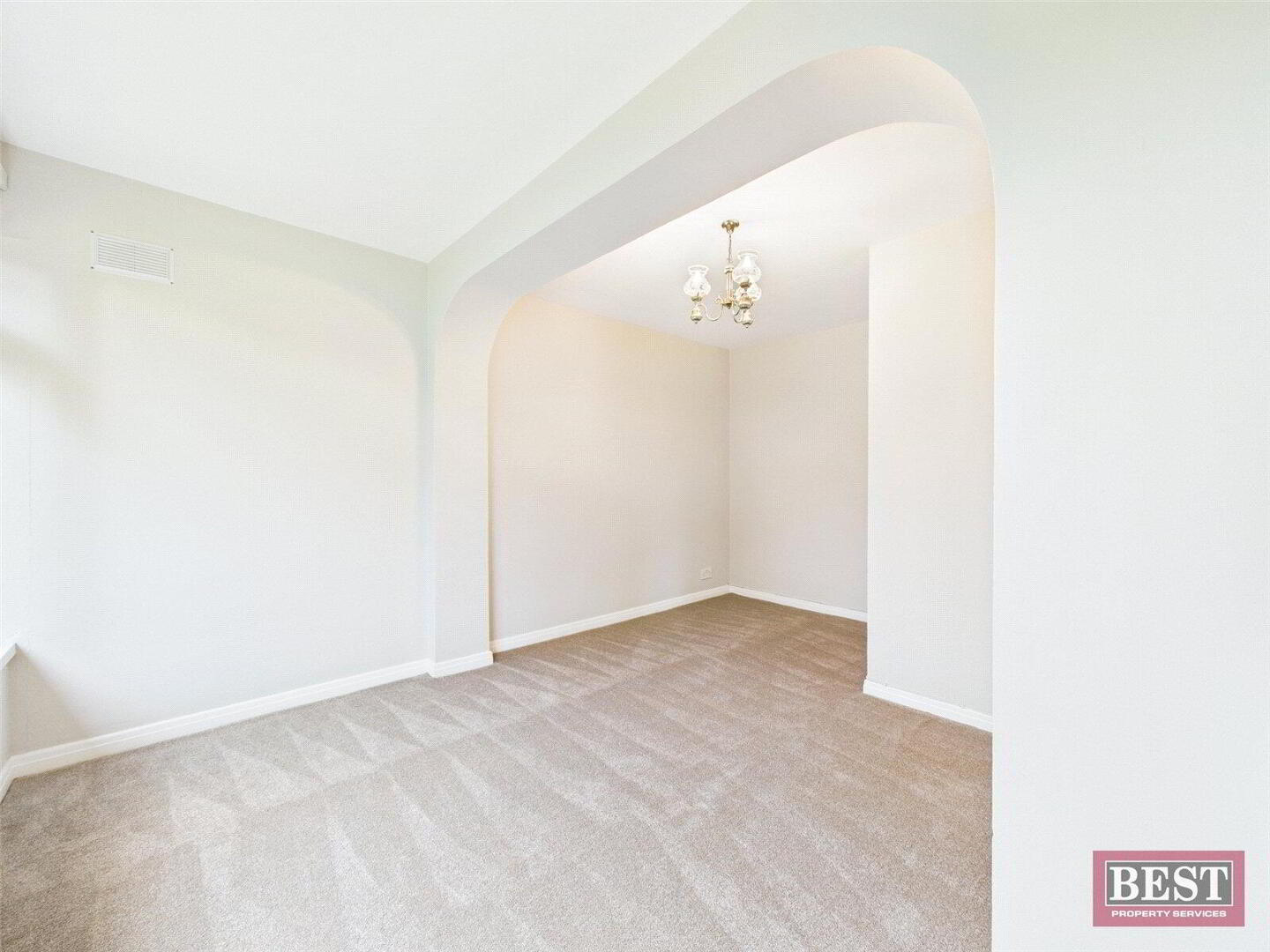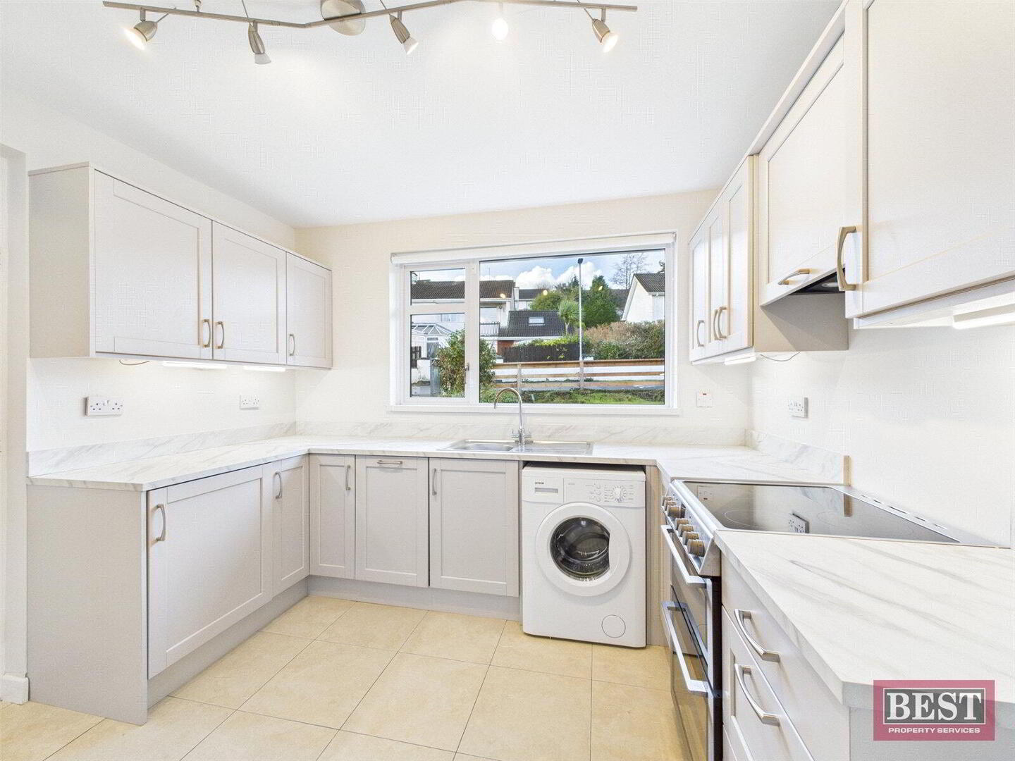 The accommodation begins with an entrance porch leading into a welcoming hallway. To the right, a bright front-facing dining room provides an ideal space for family meals or entertaining and gives access to the kitchen, which is fitted with a range of upper and lower level units along with an integrated fridge, hob, oven and washing machine. Beyond the kitchen, a separate hallway leads to the garage, offering excellent additional storage or workspace.