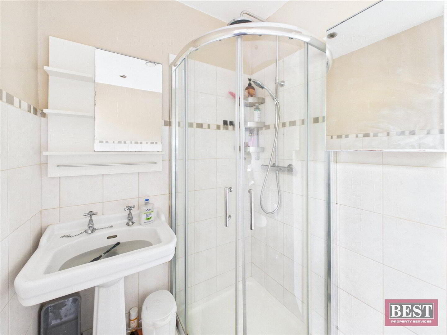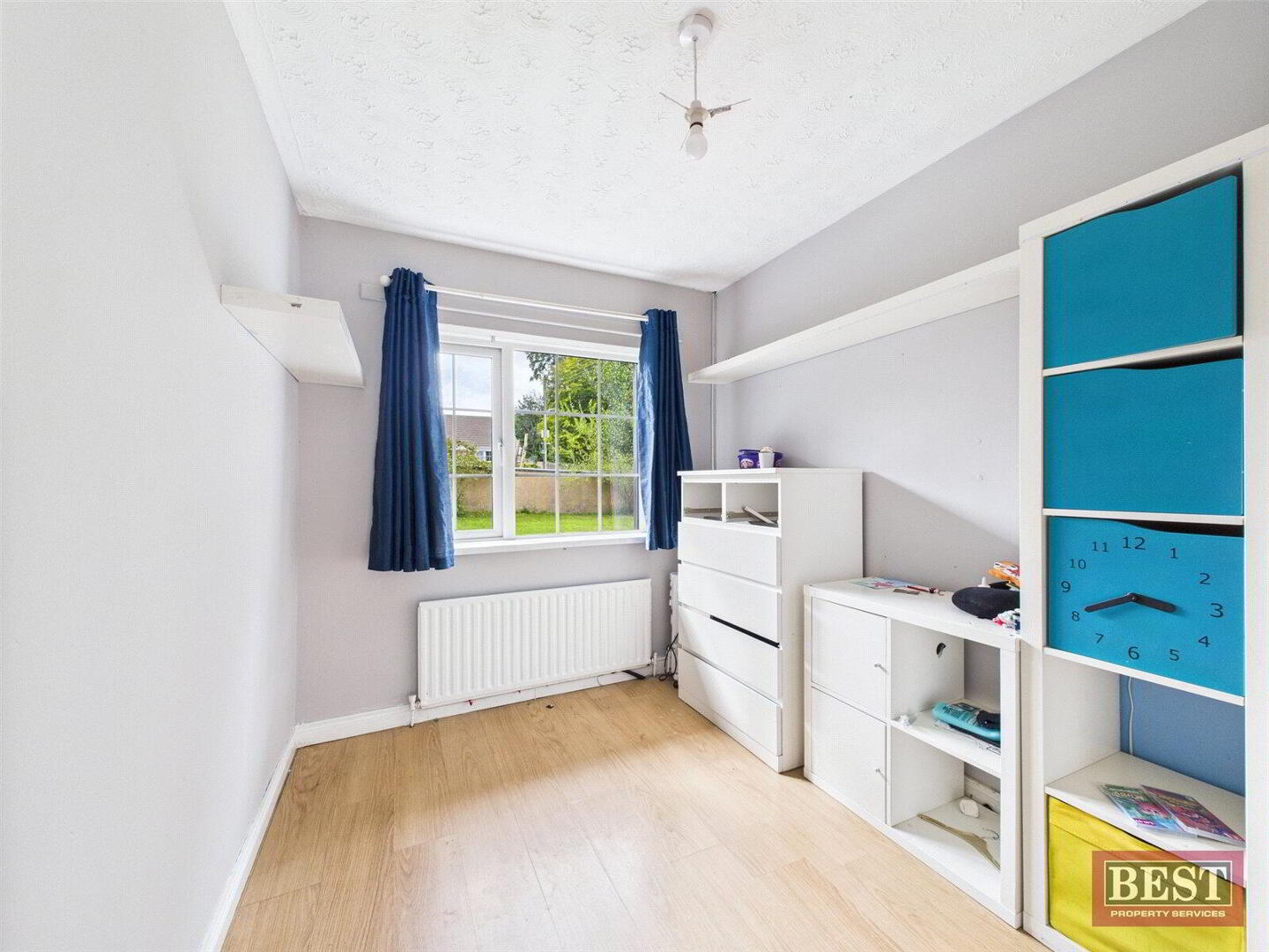 Continuing around the hallway, the family bathroom is located to the left and comprises a shower enclosure, sink with vanity mirror, and WC. Outside the bathroom is a hot press and further storage cupboard. There are a further 2 bedrooms located at the bottom of the hallway, both with laminate flooring and built-in storage.