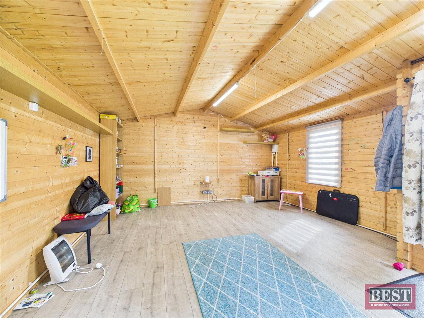 Externally, the property boasts a front garden laid in lawn with a walled boundary, and an enclosed rear garden with tarmac yard, private driveway, lawn, and a detached garage. A standout feature is the garden room, finished with laminate flooring, lighting, and fully wired for electrics — ideal as a home office, studio, or hobby space.