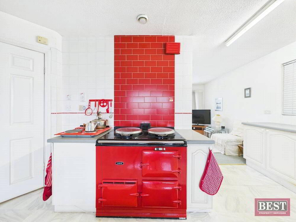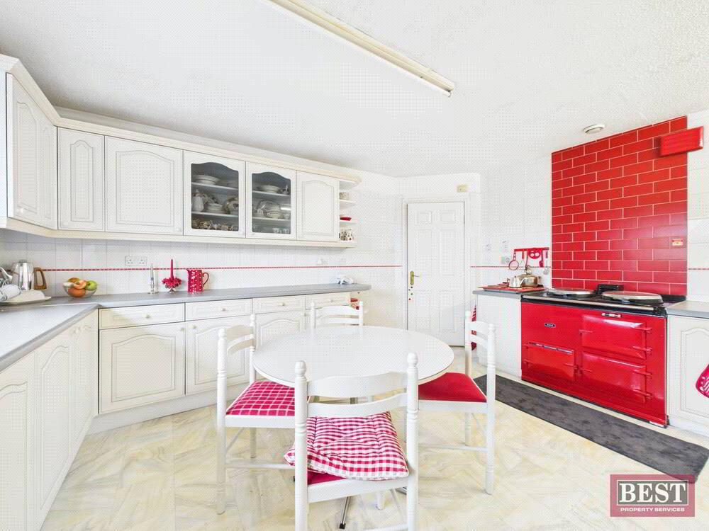 The main level also features a sizeable kitchen, with a striking red AGA that instantly becomes the focal point of the space. From here, the layout flows into a cosy living area and then into a bright sunroom overlooking the garden. A utility room, covered porch area with back door access, and an additional WC complete this floor.