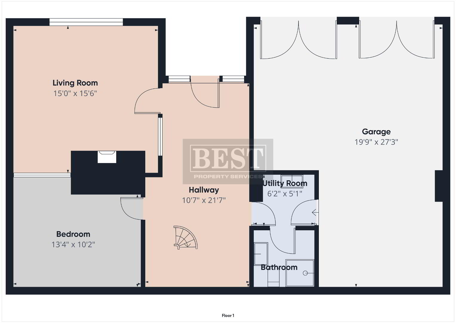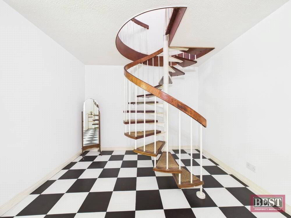Descending the spiral staircase, you enter another impressive hall area which connects to double front doors offering separate lower-ground access. This floor includes two garages, a second utility room, a WC, and an additional bedroom. There is also a generous living room / study with a large stove—perfect for relaxing on winter evenings.